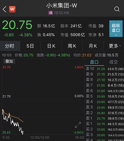 主要的权重股和科技股表现低迷。腾讯控股跌逾0.5%,阿里巴巴下跌,小米集团跌近5%,美团点评也跌近2%,中国平安、港交所也都在下跌。