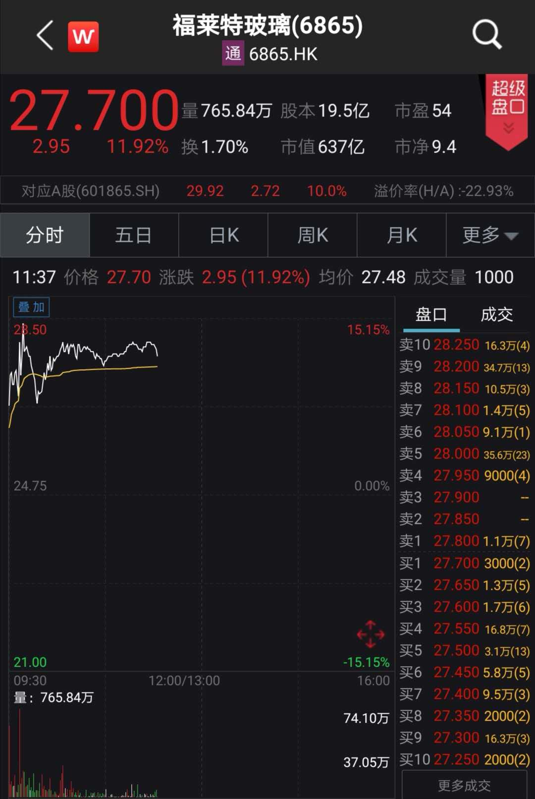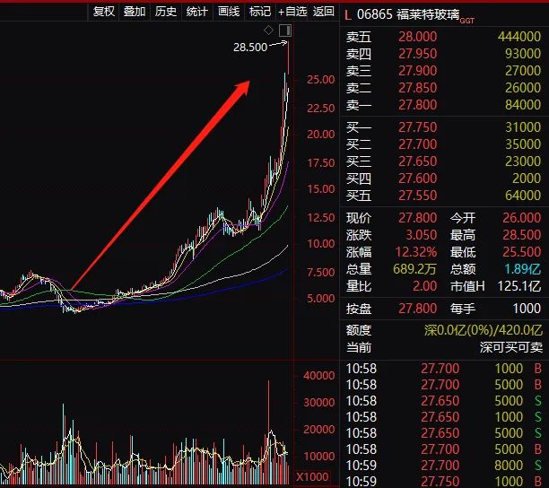 值得注意的是,今年3月底的时候,福莱特玻璃的股价一度为3.66港元,今日上午暴涨,盘中一度达到28.5港元,半年来股价涨幅达到679%。