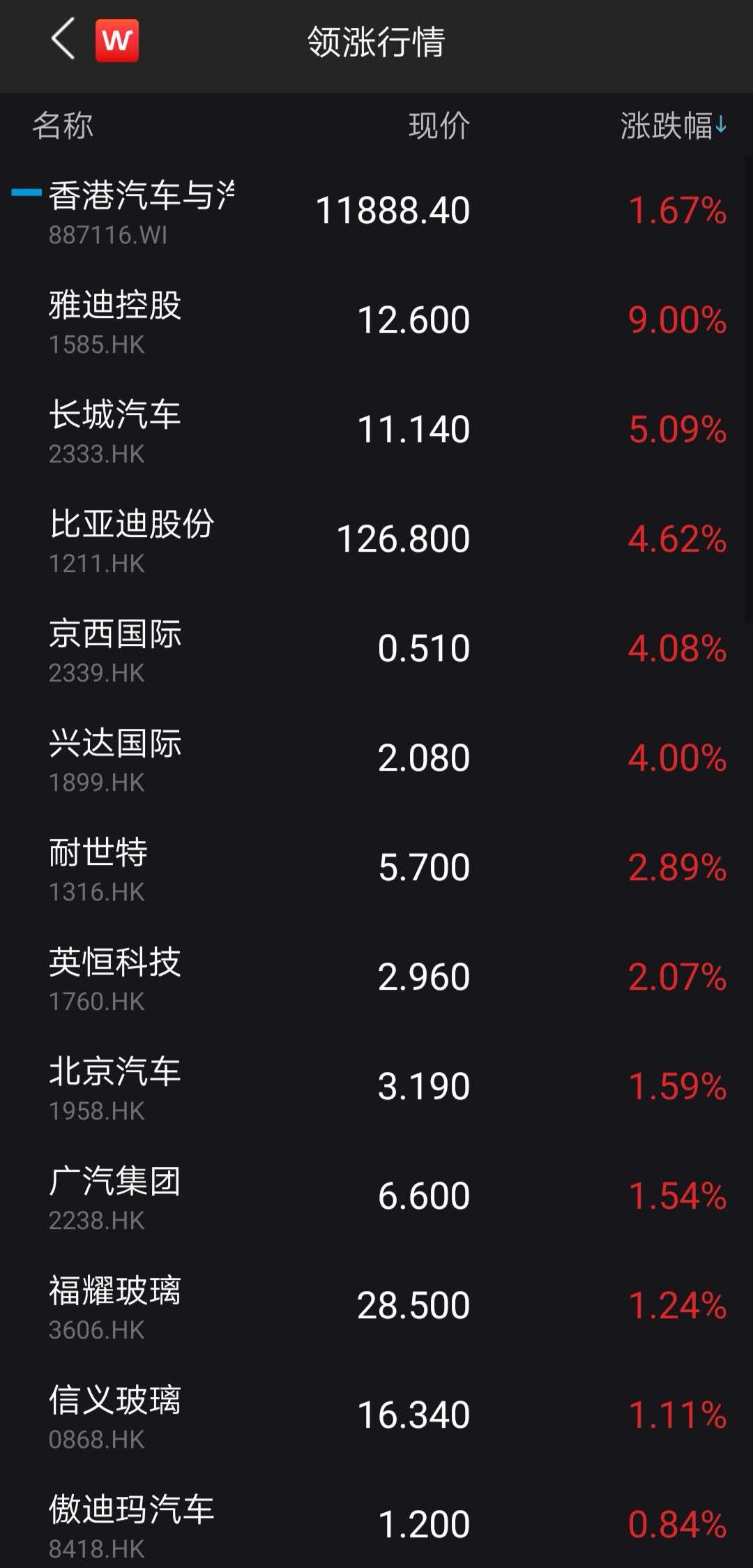 除了光伏,上午港股汽车股也表现强势,多只个股大涨。其中长城汽车涨幅达5%。比亚迪涨幅达4.62%。