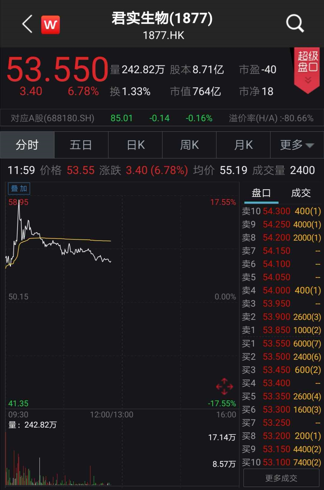 因为公告新冠治疗取得良好效果,生物医药股君实生物今日上午盘中一度大涨17%。随后涨幅回落,截至午盘,涨幅为6.78%。