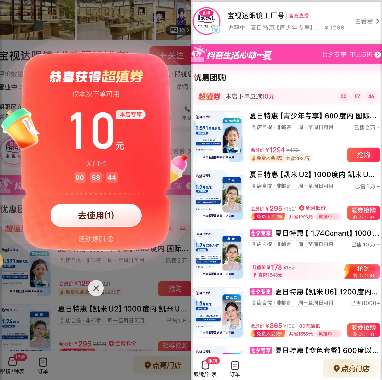 老牌眼镜商家宝视达全面线上化,走“职人矩阵”:3000+职人日更、月度产生约10万+挂券短视频,覆盖80%商品,超值券带动线上新客增长10万+,转化率高于行业均值约22%,3成新客形成复购。正如宝视达负责人所言,“超值券是新的生意机会点:用线上价格把人引来,用线下专业把人留住,一次配镜,可能就成了回头客。