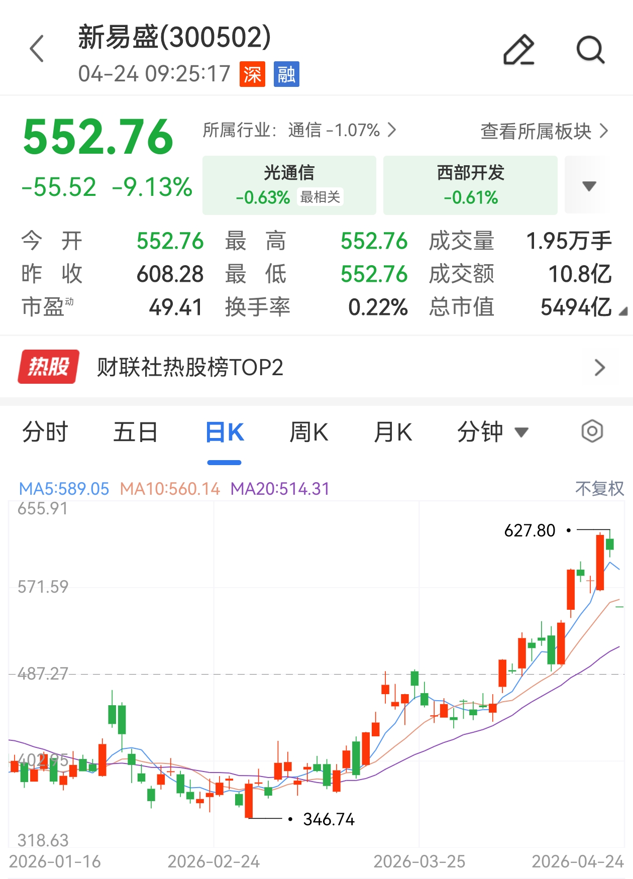 今日早间,光模块龙头新易盛股价大幅低开,报552.76元/股,跌幅达9.13%。公司昨晚发布一季报显示,公司营收高增,利润环比缩水。