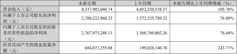 归母净利润27.80亿元,同比增长76.80%;但环比2025年第四季度的32.05亿元下降13.25%,扣非净利润27.68亿元,同比增长76.44%。