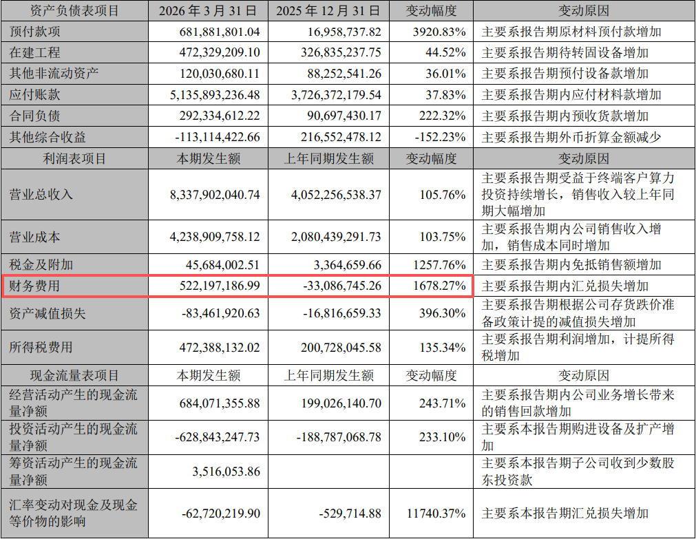 财报显示,财务费用激增是拖累Q1利润率的核心因素。一季度公司财务费用达5.22亿元,而2025年同期为-0.33亿元,环比、同比均大幅增长,主要系报告期内汇兑损失增加。