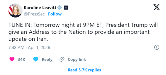 综合央视新闻等媒体报道,美国白宫周二表示,美国总统特朗普将于美国东部时间4月1日21时(北京时间4月2日9时)发表全国讲话,就伊朗问题发布“重要更新”。