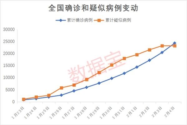 截至2月4日24时,全国累计确诊病例24324例,累计疑似病例23260例,这是1月23日武汉实施封城以来以来全国疑似病例数量首次低于确诊病例数量。