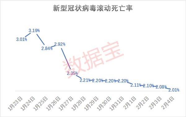 1月29日以来,新型冠状病毒滚动死亡率(累计死亡人数/累计确诊人数)始终维持在2.2%以下并持续走低,截至2月4日24时,全国累计死亡490例,病死率降至2.01%,为疫情爆发以来最低值,也大幅低于2003年SARS的全球病死率9%。湖北省新冠病毒肺炎最新病死率2.87%,武汉市4.33%,均较前几日有所下降。
