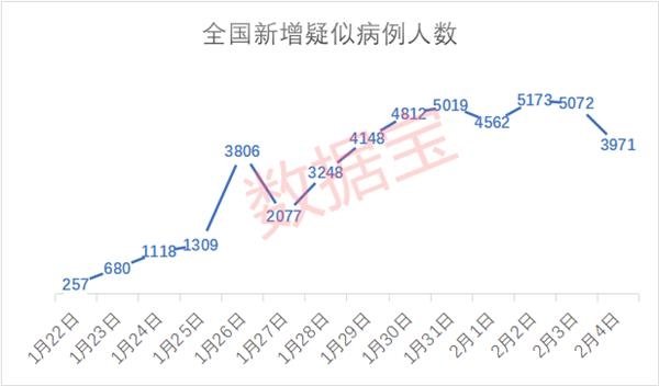 2月4日,全国报告新增疑似病例3971例,较上日减少20%,这是新增疑似病例连续第二天下降,也是疫情爆发以来新增疑似病例首次出现连续下滑。