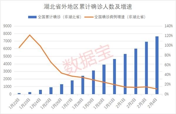 2月4日全国新增确诊病例3887例,其中湖北以外地区新增确诊731例,较前一日的890例减少了17.9%。湖北省外地区累计确诊7646例,较前一日增长10.56%,单日确诊病例增幅创新低。