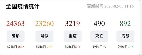 截至发稿,全国已累计确诊新型冠状病毒肺炎病例24363例,疑似病例23260例,死亡490例,治愈出院892例。