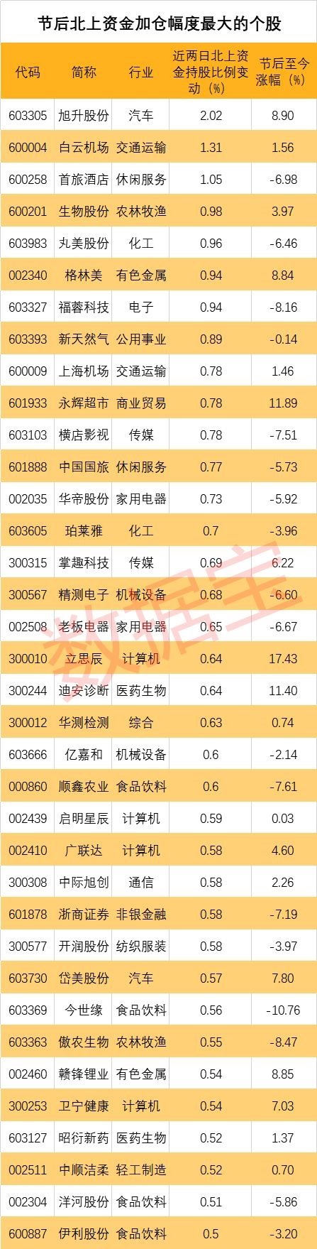 从持股比例变动来看,节后前两个交易日北上资金共加仓644股,减仓553股,对36股的持股比例增长超0.5个百分点。旭升股份、白云机场和首旅酒店获加仓幅度最大,北上资金持股比例增加均超过1个百分点。