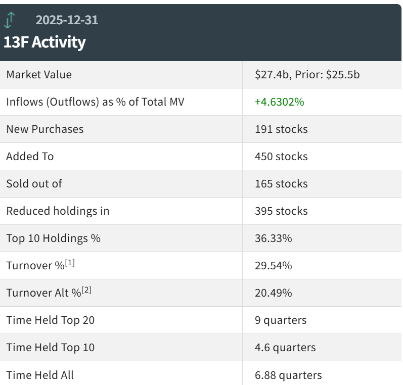 报告显示,桥水第四季度持仓总市值达274亿美元,上一季度总市值为255亿美元。桥水在第三季度的持仓组合中新增了191只标的,增持了450只标的;同时,桥水减持395只标的,清仓165只标的。其中,桥水的前十大持仓标的占总市值的36.33%。