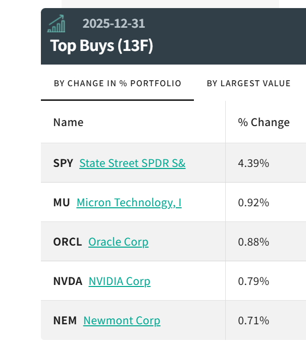 桥水第四季度买入最多的五大标的分别是标普500指数ETF-SPDR(SPY.US)、美光科技、甲骨文、英伟达和全球最大的黄金生产商之一纽蒙特矿业Newmont Corporation。