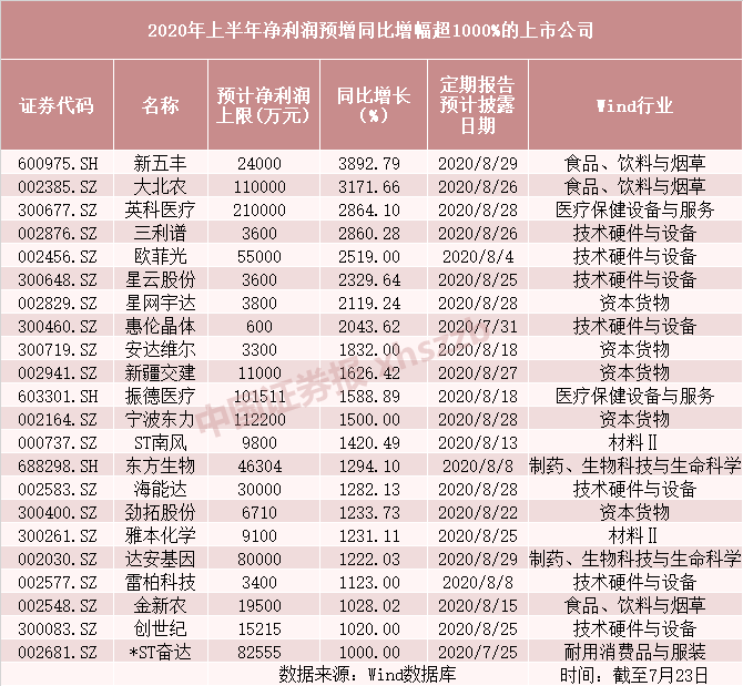 新五丰、大北农、英科医疗、三利谱等22家上市公司上半年净利润同比增逾1000%。
