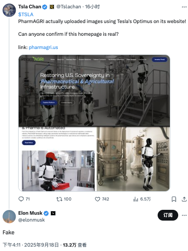 对于涉事公司的主张,社交媒体上的质疑也集中在公司简陋的网页。经过数日发酵后,马斯克终于对此事发表意见,他在一条有关PharmAGRI主页满是Optimus机器人的帖子下面给出回应。