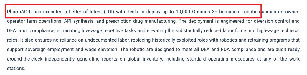 在这份平平无奇的公告中,藏着一条令资本市场感到震惊的消息:名不见经传的PharmAGRI宣布与机器人、AI和电动车龙头特斯拉合作,并声称双方已签署意向书(LOI),将在其自营农场、原料药合成与处方药生产中部署多达1万台Optimus 3+机器人,在符合劳工法规的前提下消除低薪重复性工作。