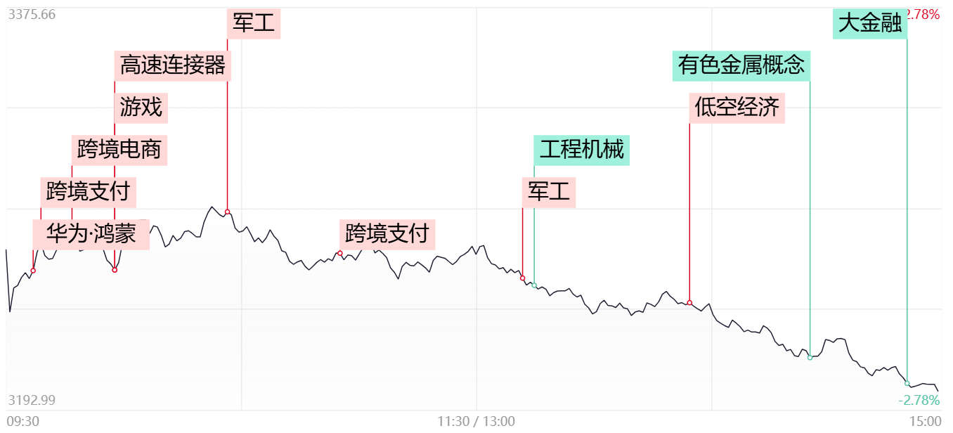 ①今日市场全天震荡走低,三大指数均跌超2.5%。其中军工、电商等板块逆势活跃,大金融板块再度跌幅居前。