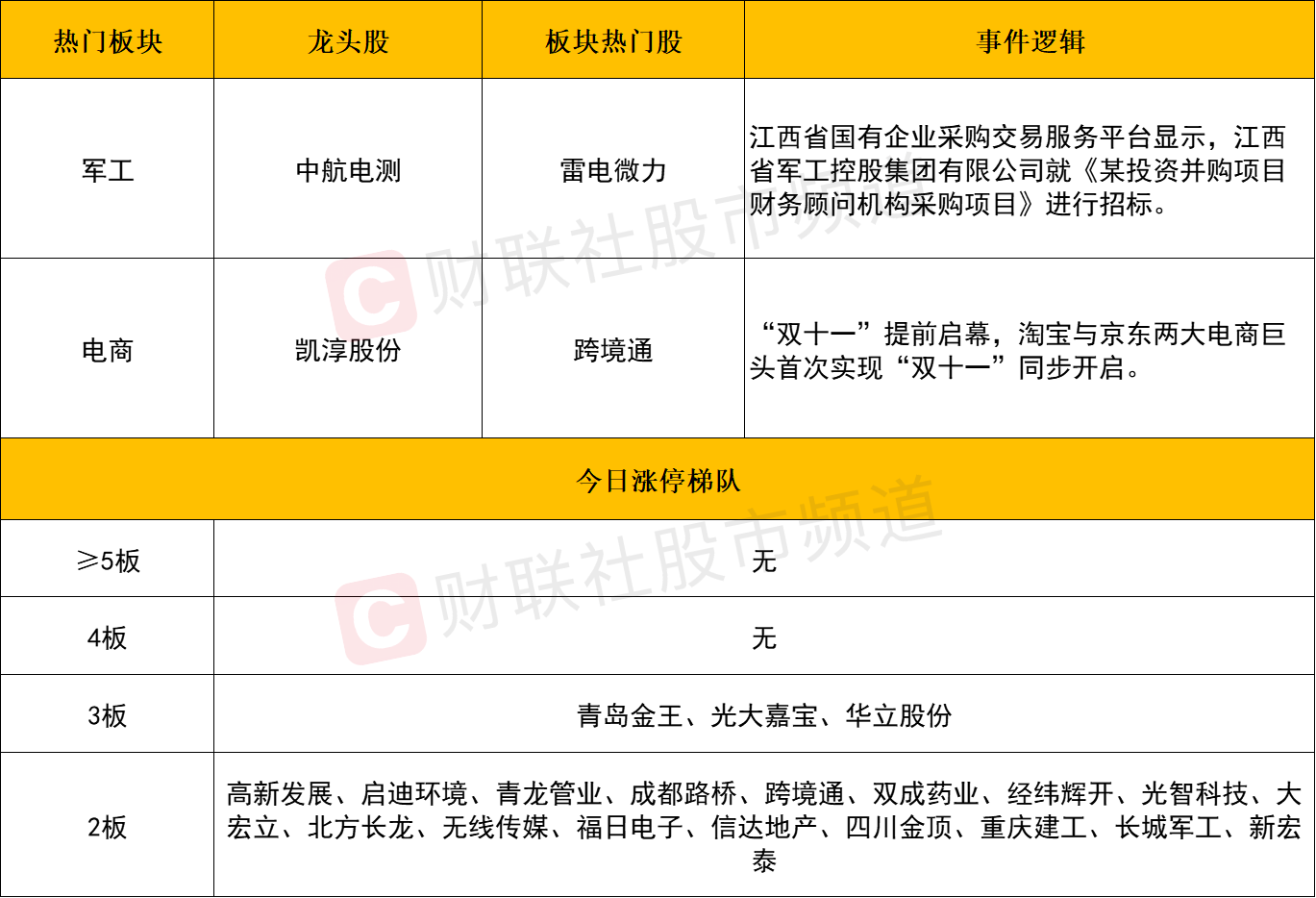 板块上,电商概念涨幅居前,凯淳股份、跨境通涨停,青木科技、赛维时代、星徽股份、三态股份等个股跟涨。消息面上,“双十一”提前启幕,淘宝与京东两大电商巨头首次实现“双十一”同步开启。