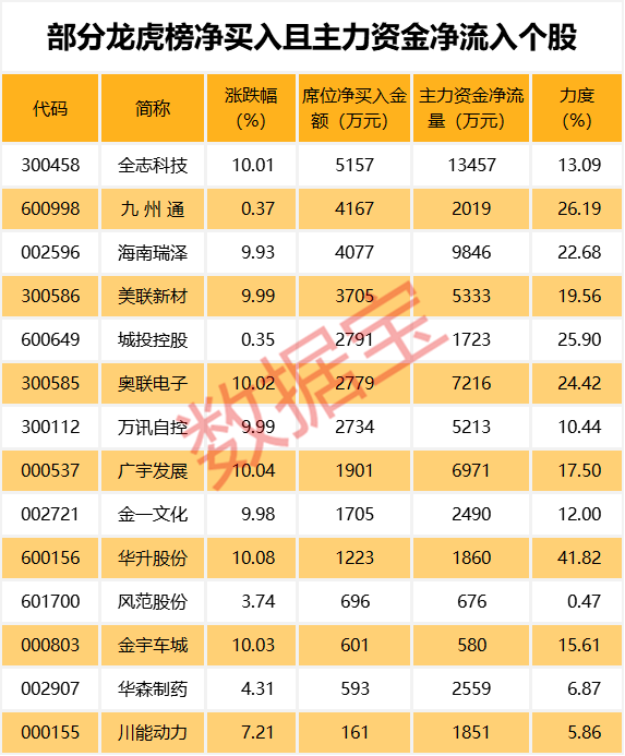 速看!龙虎榜净买入+主力资金净流入个股出炉
