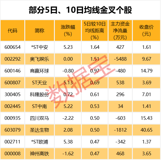 截至最新收盘,有26只A股的5日均线主动上穿10日均线,其中*ST中安、奥飞娱乐、商赢环球等个股的5日均线较10日均线距离最大,分别达1.64%、1.51%、0.97%。