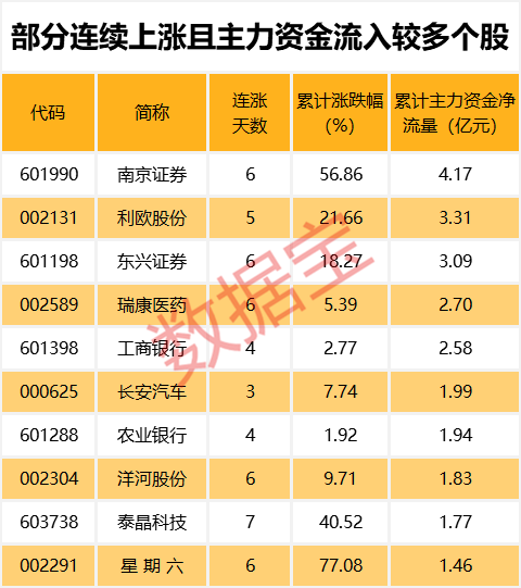 值得注意的是,212只连续上涨个股中,16只个股期间主力资金累计净流入超过亿元。其中,累计资金流入最多的为南京证券,主力资金累计流入4.17亿元。