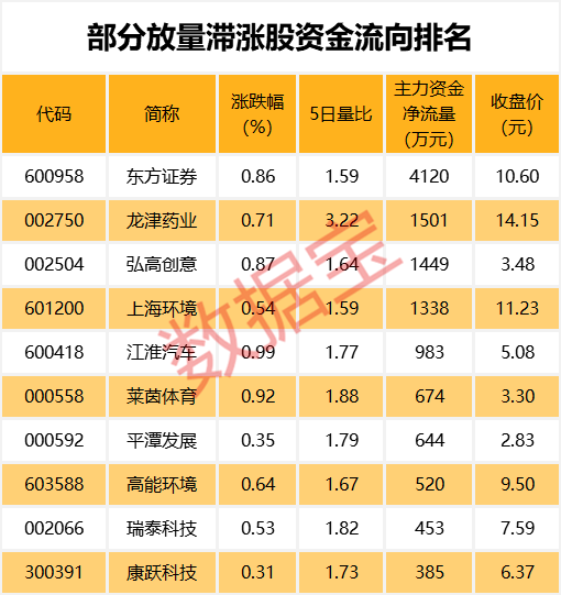 最新数据显示,两市共有51只A股放量滞涨,其中宁波热电、金科文化、龙津药业等个股5日量比最大,分别达4.16、3.59、3.22。值得注意的是,51只放量滞涨股中,东方证券、龙津药业等个股主力资金净流入最多,分别达到0.41亿元、0.15亿元。