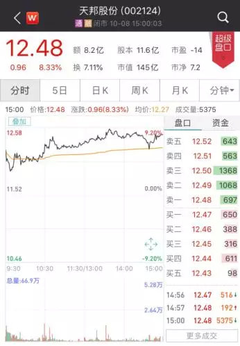 其中天邦股份领涨,涨幅为8.33%,报12.48元,成交8.21亿元,最新总市值145亿。