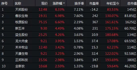 另外,傲农生物、牧原股份上涨超6%,新五丰、益生股份上涨超4%,龙大肉食、禾丰牧业等也出现一定程度的上涨。