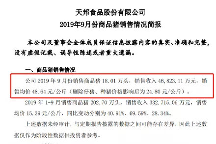 另外,根据天邦股份商品猪销售情况简报,2019年9月份销售商品猪18.01万头,销售收入4.68亿元,销售均价48.64元/公斤(剔除仔猪、种猪价格影响后为24.8元/公斤)。截至9月底,天邦股份今年已销售商品猪202.7万头,销售收入达到33.27亿元,销售均价为15.39元/公斤,同比变动分别为40.91%、69.59%、28.34%。