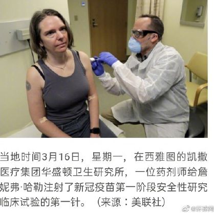 美联社注意到,这项疫苗试验的第一位参与者是一家小型科技公司的运营经理、43岁的西雅图人詹妮弗·哈勒(Jennifer Haller)。她在检查室接受了疫苗注射。