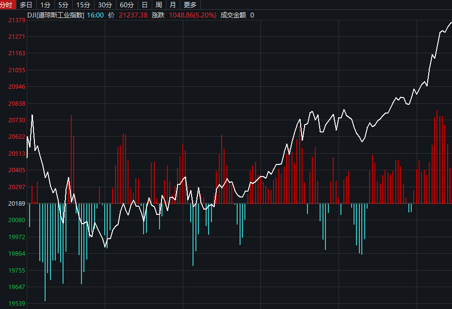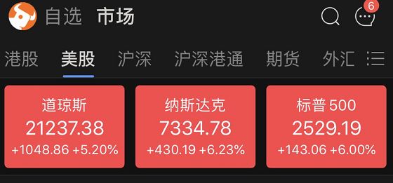 截至收盘,道指涨5.2%报21237.38点,标普500涨6%报2529.19点,纳指涨6.23%报7334.78点。