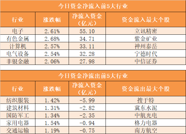 28个申万一级行业中,22个行业实现资金净流入,其中电子行业净流入55.1亿元居首。
