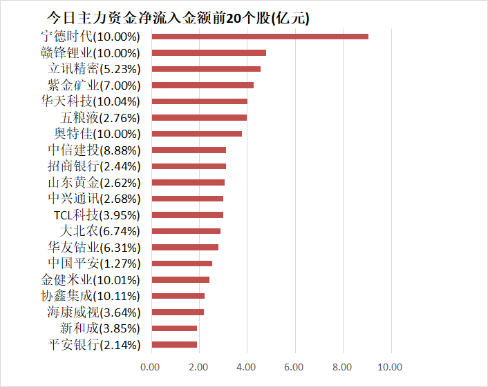 沪深300今日主力资金净流入94.75亿元,创业板净流入28.6亿元,中小板净流入43.79亿元。沪股通净流入58.45亿元,深股通净流入106.67亿元(本文中沪股通、深股通净流入额以当日已用额度来计,与成交净买入额略有差异,但表示的意义大体一致)。