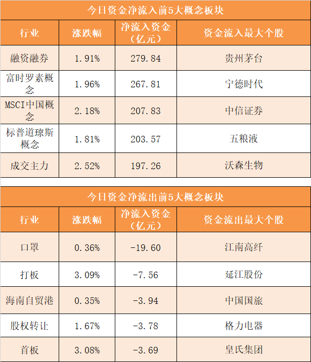 概念板块方面,今日融资融券、富时罗素概念、MSCI中国概念、标普道琼斯等概念板块资金呈现净流入,其中融资融券概念净流入279.84亿元居首。