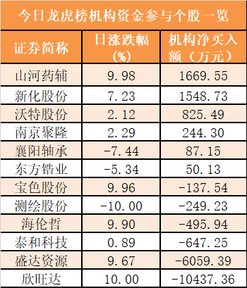 盘后龙虎榜数据显示,机构现身12股,其中山河药辅等6股呈现机构资金净买入,欣旺达等6股呈现机构资金净卖出。