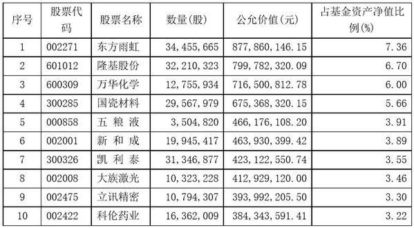从前十大重仓股来看,持股数量方面,较2019年三季度末而言,隆基股份、国瓷材料增持明显,而立讯精密则被减持了1000多万股。截至2019年四季度末,前十大重仓股分别为东方雨虹、隆基股份、万华化学、国瓷材料、五粮液、新和成、凯利泰、大族激光、立讯精密和科伦药业。