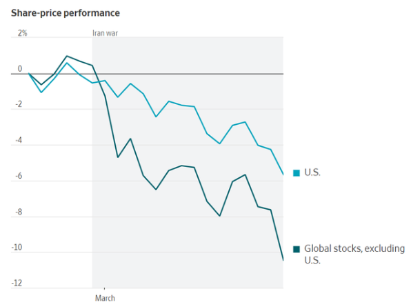 从上图可以看出,“走向全球化”的叙事显然已被颠覆——即“卖出美国”资产。这正对美国以外的股市造成震荡,令年初买入该策略的投资者遭受重创。现在,鉴于美国经济能源独立(美国是能源净出口国),全球投资者现在开始将长期冲突的预期计入股价。