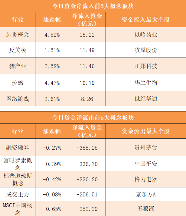 概念板块方面,今日肺炎概念、反关税、猪产业、流感等概念板块资金呈现净流入,其中肺炎概念净流入18.22亿元居首。