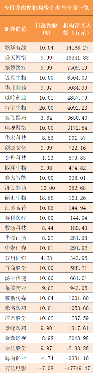 盘后龙虎榜数据显示,机构现身33股,其中歌华有线等17股呈现机构资金净买入,万达电影等16股呈现机构资金净卖出。