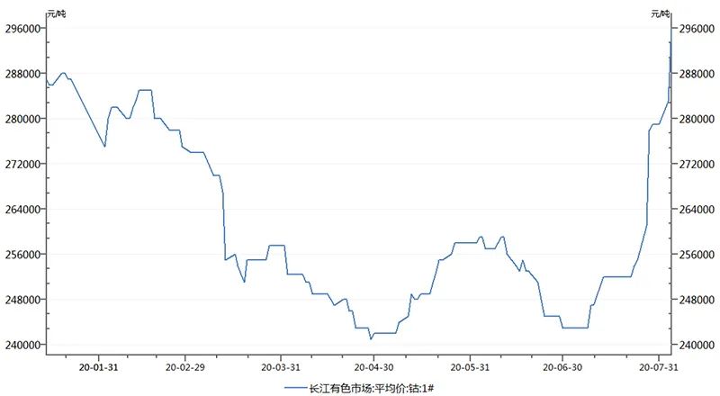 3月上旬至6月底,钴价身处低位,最低触及24.1万元/吨,累计最大跌幅达13%。而在7月份,钴价上涨超14%,仅用1个月就收复了前4个月的跌幅。