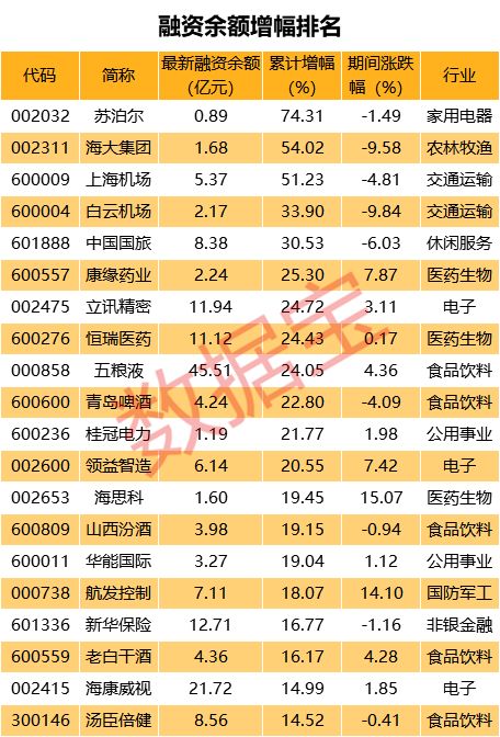 统计发现,融资余额增幅超20%的个股中,电子、交通运输、食品饮料行业相对集中,均有2只个股入围。