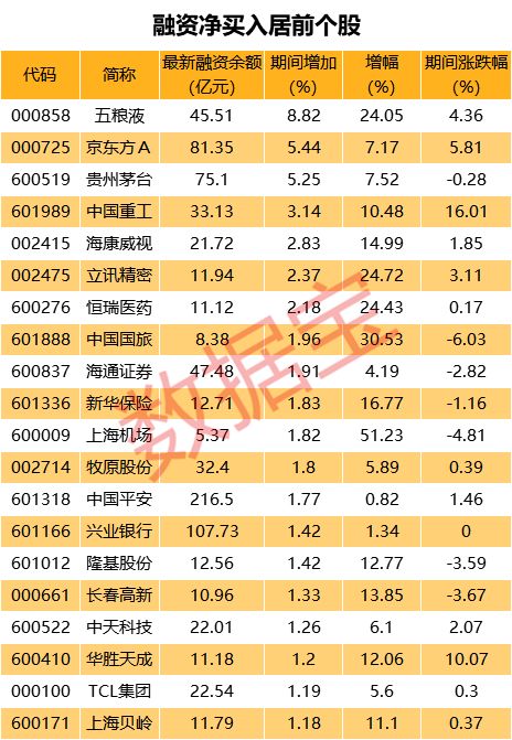 融资余额增加最多的是五粮液,期间融资余额累计增加8.82亿元,增幅为24.05%;京东方A、贵州茅台等融资余额分别增加5.44亿元、5.25亿元,位居第二、第三。