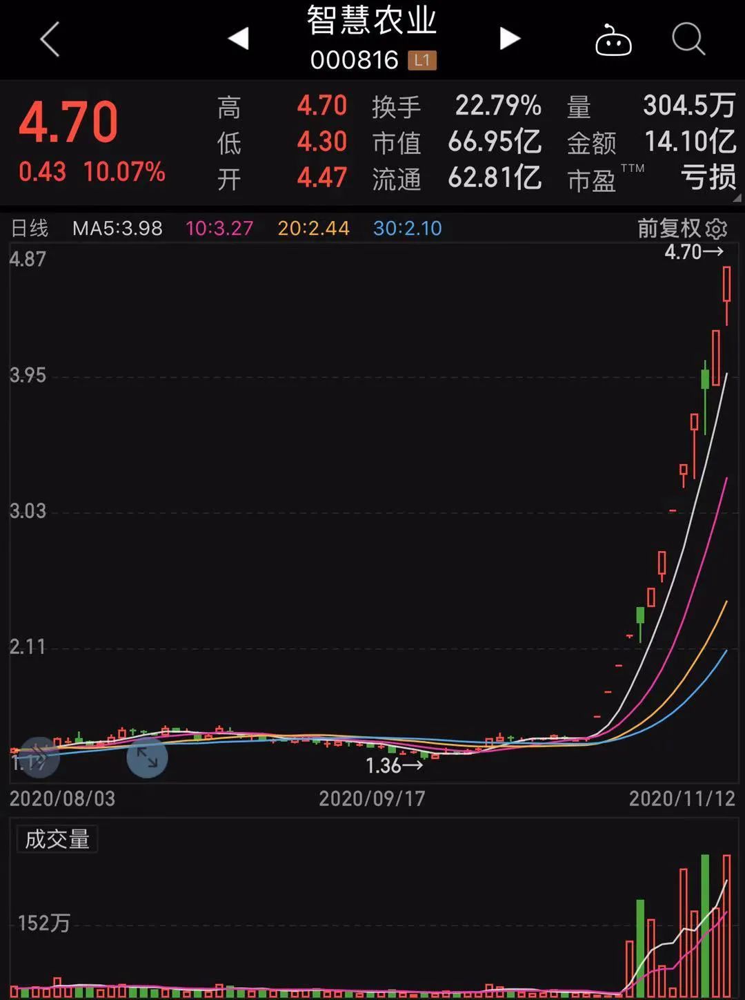 13天11个涨停板,智慧农业一战成名。昨日,智慧农业再次涨停,最新市值67亿元,自10月27日摘帽(撤销风险警示)以来,累计涨幅已达到213.33%,堪称这段时间最热门股票。