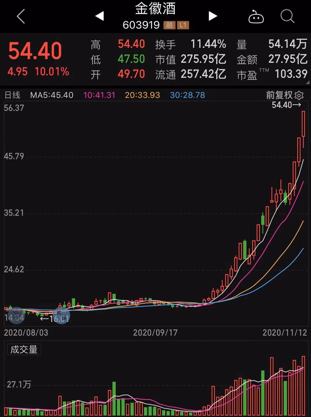 与智慧农业同样大热的还有白酒股金徽酒,该股目前已三连板,最新收盘价创历史新高,A股市值276亿元,年内累计涨幅达300%以上。金徽酒昨晚发布风险提示,截至2020年11月12日,公司股票静态市盈率为101.97、市净率为10.59,明显高于同行业平均市盈率、市净率。