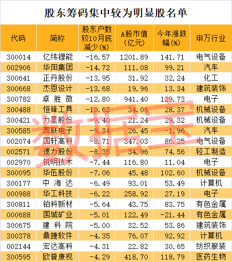 除了酿酒板块,哪些股票获主流资金青睐呢?股东数据的变化也能看出些端倪。一般说来,股东人数越少、表明筹码越集中,因而越有可能是主力控盘,后市出现大行情的概率大增;股东人数越多,表明筹码越分散,短期出现行情的可能性较小。 投资者除了在定期报告中获得股东信息数据外,还可以在交易所互动平台上通过提问方式了解部分公司更及时(每月10日、20日、月末)的股东户数信息。以往3期分别有453只、452只、327只股票在互动平台透露了股东户数。 证券时报·数据宝统计显示,截至发稿,共有53股最新股东户数较10月底环比减少1%以上。亿纬锂能、华阳集团、正丹股份、杰恩设计、卓胜微、恒锋工具等6股环比减少10%以上,亿纬锂能股东户数减少比例最高,达到16.57%。亿纬锂能主营业务是锂原电池和锂离子电池的研发、生产、销售,是锂电池领域的龙头之一,11月11日该股创历史高点,最新A股市值1202亿元。