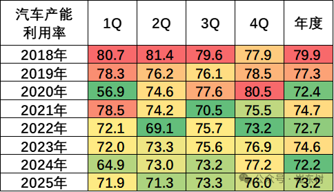 2025年四季度,全国规模以上工业产能利用率为74.9%,比三季度上升0.3个百分点,比上年同期下降1.3个百分点。2025年全国规模以上工业产能利用率为74.4%。分主要行业看, 2025年汽车行业产能利用率73.2%,相对处于较低水平。