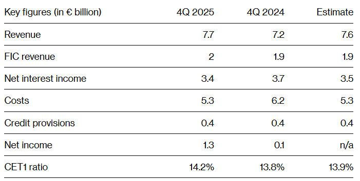 2025 年归属于股东的净利润为 61.2 亿欧元(73 亿美元),这得益于其全球投资银行业务的强劲表现。这比一年前的 27 亿欧元高出不少,也略高于分析师预期的近 60 亿欧元。