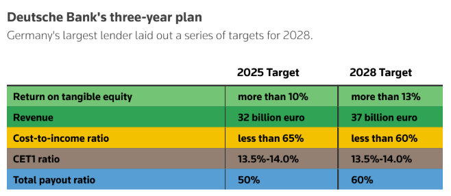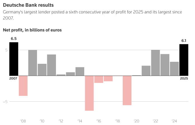 其CET 1资本充足率(可反映银行偿付能力)第四季度为14.2%,略低于上一季度的14.5%,但高于2024年同期的13.8%。2025 财年也标志着德意志银行为期三年的财务计划的结束,该计划中德意志银行承诺并实现了超过 10% 的关键利润目标(即有形权益回报率)。