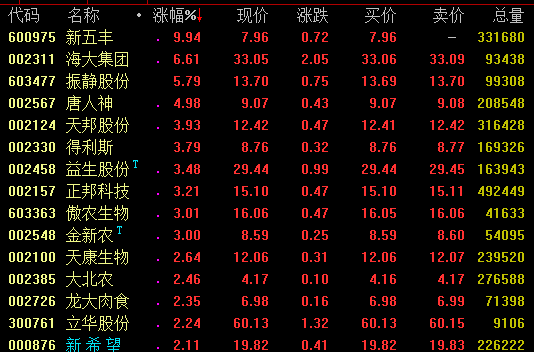 猪肉概念股17日盘中震荡上扬,截至发稿,新五丰涨停,海大集团、振静股份涨约6%,唐人神涨约5%,天邦股份、得利斯、益生股份、正邦科技、傲农生物等涨幅超3%。