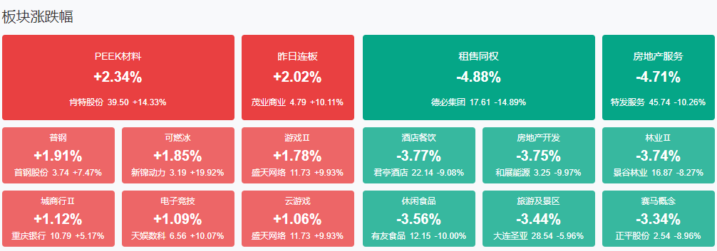 板块方面,PEEK材料、游戏、银行、算力等板块涨幅居前,房地产、旅游、食品、化债概念等板块跌幅居前。截至收盘,沪指跌0.03%,深成指跌0.43%,创业板指跌0.55%。